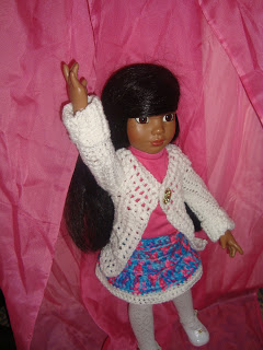 I brushed her hair to the side, crocheted her a sweater with a gold button and a multicolored skirt and gave her lots of tender love and care. Doesn't she look brand new!